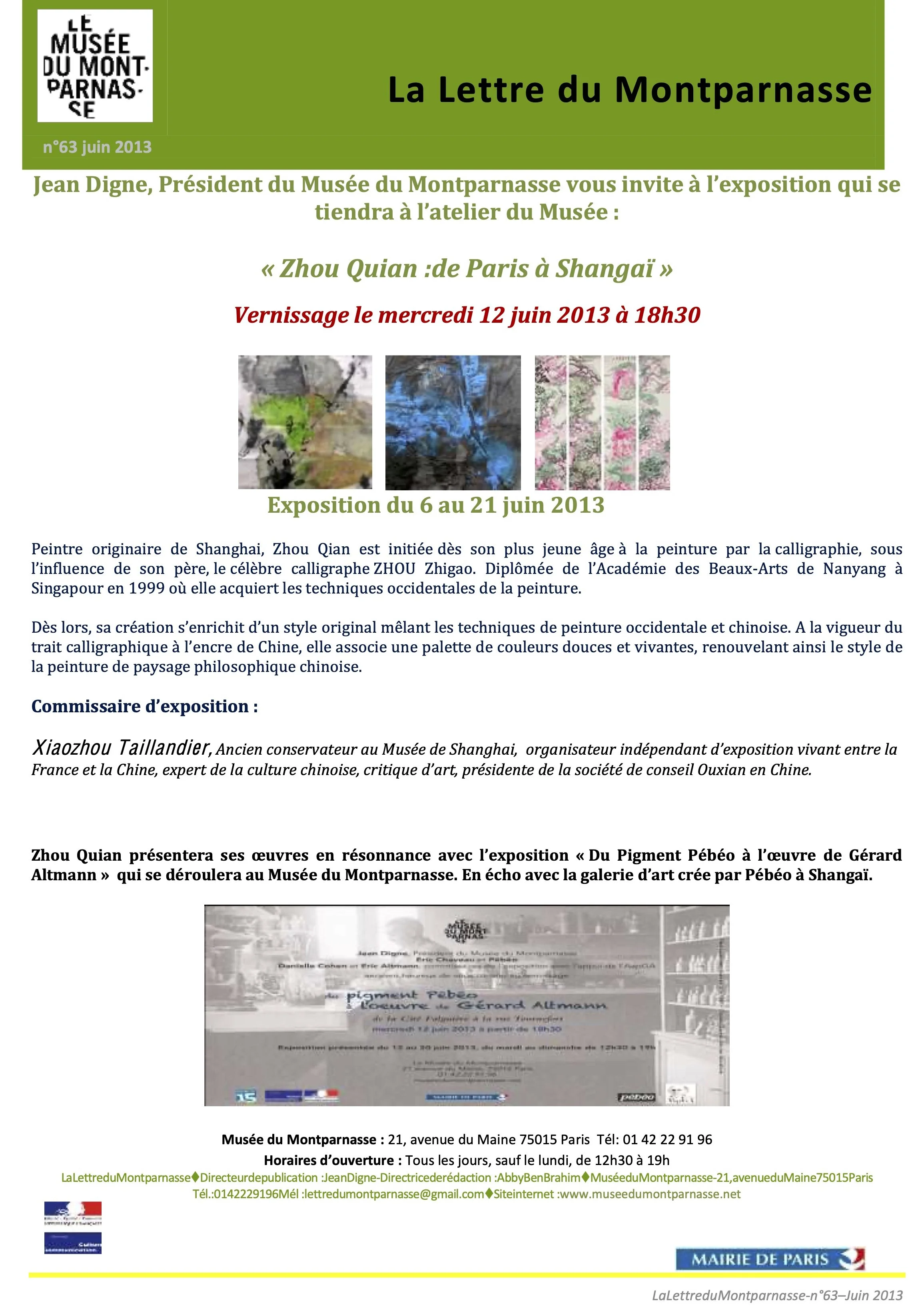 ZHOU Qian From Paris to Shanghai ZHOU Qian de Paris a Shanghai Solo art exhibition Montparnasse Museum, Paris, 2013